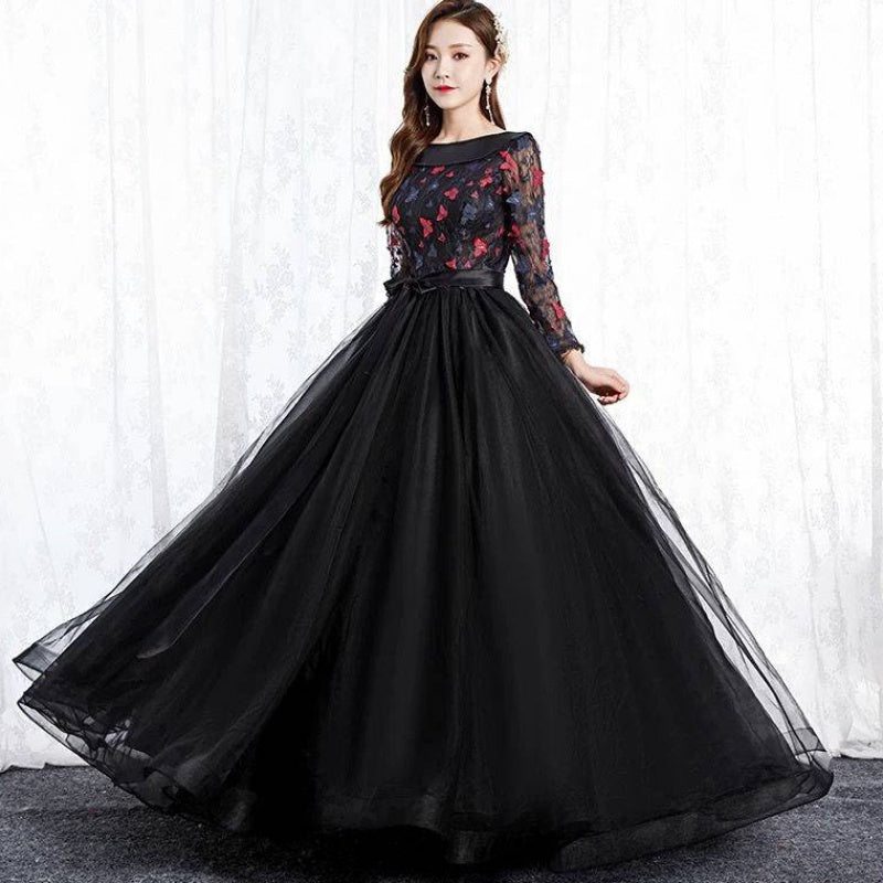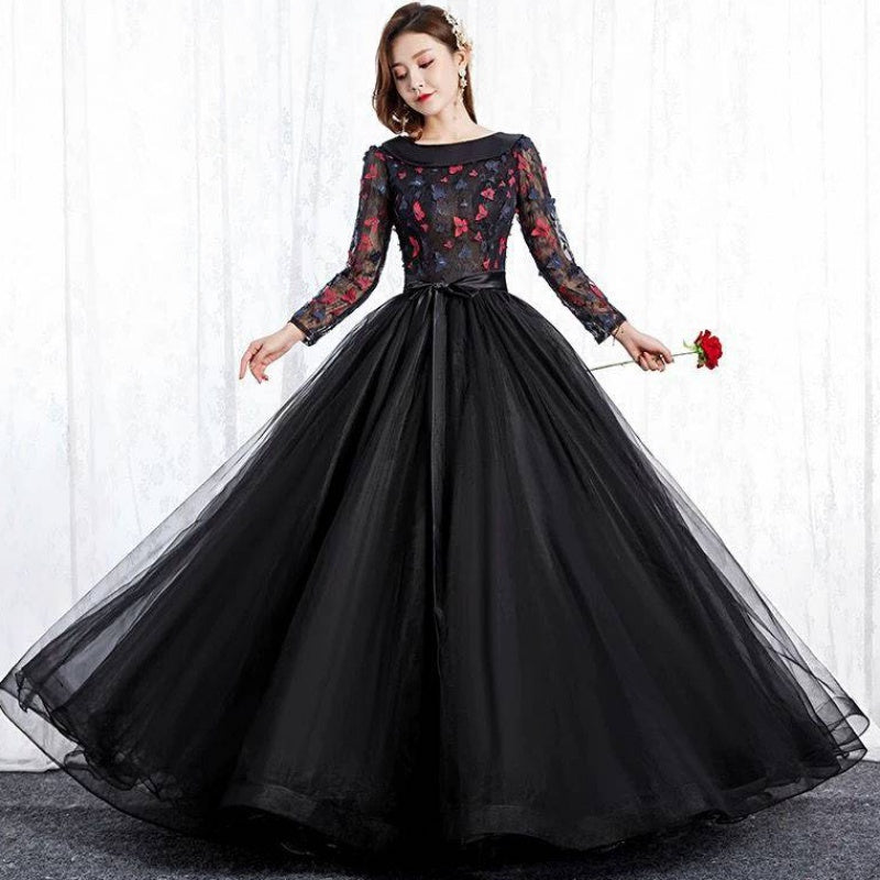 Black Park Collar Evening Dress Solo Host Performance, Pettiskirt Long Female